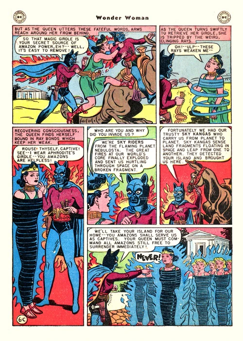 The Sky Riders appeared in Wonder Woman no.23 in 1947. The story was republished in 1974 with different artwork. The Sky Riders were a group of alien women who invaded Paradise Island during Wonder Woman's childhood and tried to enslave the Amazons. They wore bestial masks and rode on flying mammals called Kangas.