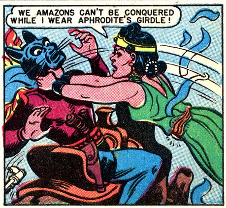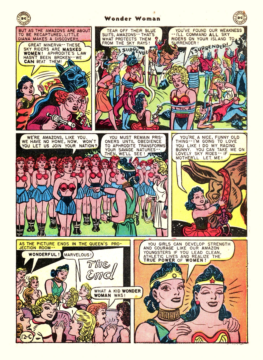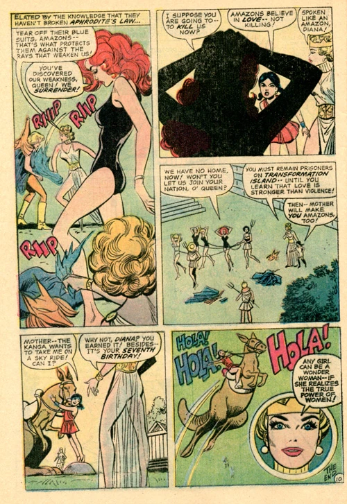 The Sky Riders' leader asks if they can be allowed to join the Amazons. Queen Hippolyta did not trust them, however, and had them sent to the Amazon prison on Transformation Island, to be taught the Amazon discipline of obedience to loving authority. They are led away in their underwear.