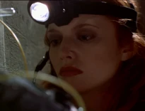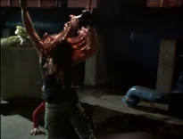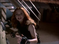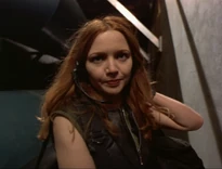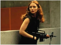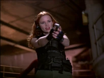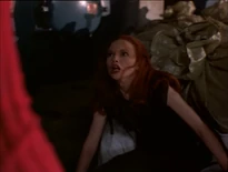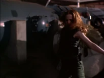 She is eventually sent by her boss to pursue and execute Chase (the hero played by Jeff Fahey). As she is about to do so, she gets caught up in an intense catfight with Melissa (the heroine played by Carrie-Anne Moss). To her surprise, the red-haired villainess gets a bit of a thrashing and pulls a knife from her boot. Sparky is about to kill Melissa when Chase picks up the villainess' gun and shoots her in the back. Sparky releases a high-pitched scream and falls down on her belly, dying instantly. Hero and heroine leave her body behind as they try to make their way out of the plant.