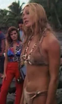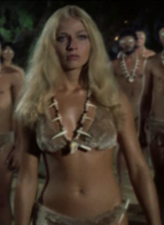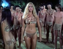 Syrene along with her father rule a remote island of inbred oversized eyed natives. The natives have what looks like ping pong balls for eyes, with black dots painted on them. They are able to live on land as well as in water, and they have an extensive hoard of pearls. Syrene spends the entire film dressed in a skimpy animal skin bikini, and wearing a sharks tooth necklace.