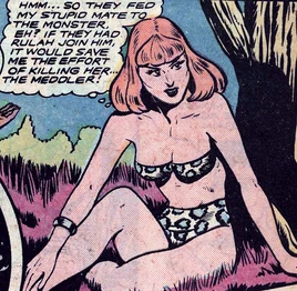 She has a dislike of the heroine Rulah, for not being jungle born and wants her dead. She also wants to clear the village so she can obtain gold hidden in the great stream. To do this she has her mate Umar bring deadly octopuses to the river to kill and scare the natives. The natives learn of this plan and kill Umar by feeding him to his own octopuses. Taho discovers this and is content with Umar's death.