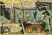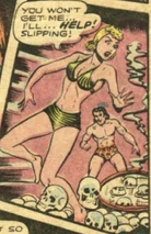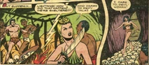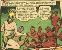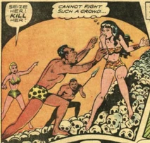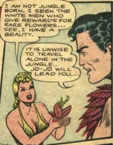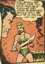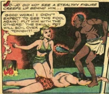 Jo-Jo eventually found Tala's underground lair which was lined with the skulls of her victims. She had tied up two white botanists, and near them she was stiring a large boiling caldran with skulls in it. Jo-Jo was knocked over the head by a native and tied up alongside the botanists.