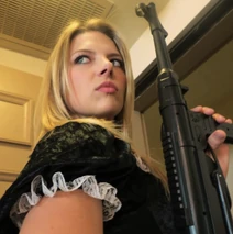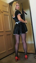 Just as they are about to kiss, they are interrupted by a "Freeze!" coming from the doorway. Looking up there is a lovely blonde dressed in a French Maid outfit holding a MP40 submachine gun. The outfit includes a one-piece black satin skirt dress, with white ruffles around the bottom of the skirt and top of the blouse. She has a white apron around her waist and a black one-inch thick velvet choker around her neck. She is wearing orange high heels, and black fishnet stockings that accentuate her lovely legs.