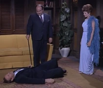Smart locates Agent 13 hiding in a couch in the study, and after some prodding figures out that Tracy plans to kill him at midnight. At the stroke of midnight, Smart motions to Tracy to join him in the study. On her way to the room, she is surprised by a party goer who embraces her and gives her a kiss. The man is poisoned and slumps dead to the ground as Tracy brushes past him.