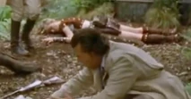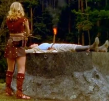 We later see Ursula about to sacrifice Marguerite with a knife, who is tied down on a tree trunk.