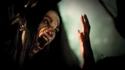 As the video progresses, Sonja's transformation continued, and her presence surprised a driver and passenger on the road, leading to the car crashing. Both men survived the crash, but afterwards, the evil Sonja (in her full werewolf form) killed the driver and did the same to the passenger. The villainess continued prowling in the woods, where she found a male camper and mauled him to death as well. The video ends with the footage of the full moon on Sonja's TV screen.