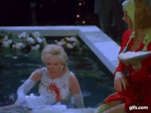 Finally, Cybill picked up a pie plate and started toward Andrea who began backing up and saying no. Eventually, she backed up to a walled pond, and she fell backward into it. After climbing up and onto the ledge, Cybill proceeded to smashing the pie in Andrea's face.