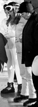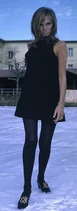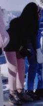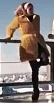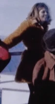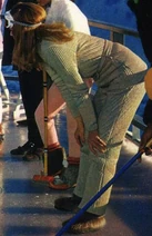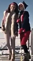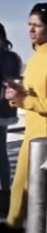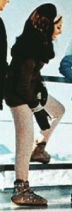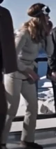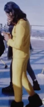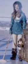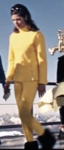 The next day up on the observation deck during the curling activity, the German Girl is dressed in a yellow ski outfit with black boots. Her hair is in a ponytail.