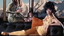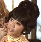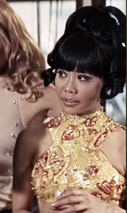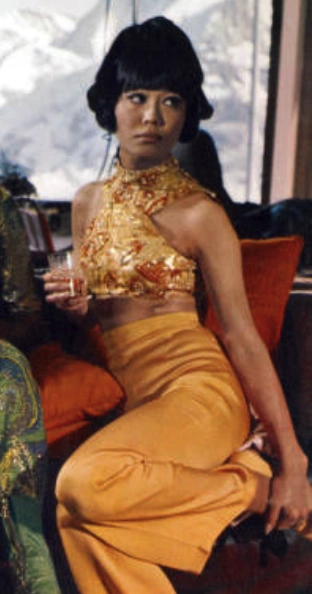 When Sir Hillary arrives at Piz Gloria, the Chinese Girl sits on the couch with him next to the Irish Girl. During dinner, she uses chopsticks to eat a bowl of rice.