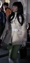 In the Alpine Room, while the girls are receiving their final instructions, the Chinese Girl is dressed in an olive colored turtleneck sweater with matching leggings. She has white boots and a white skirt on. Her brunette hair is hanging straight.