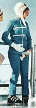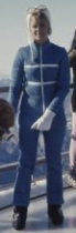 When Sir Hillary meets the girls on the observation deck for their game of curling, the Jamaican Girl is dressed in a black ski suit with a white band around her head.