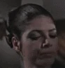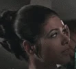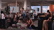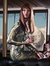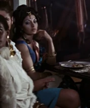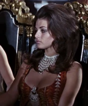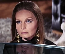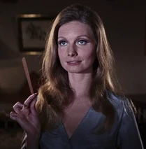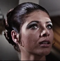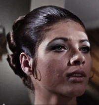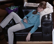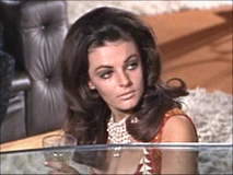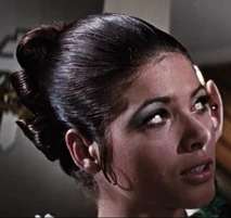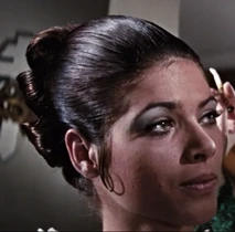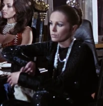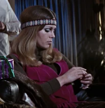 Nancy has long brown hair and is dressed in a sheer black semi-see through top with multi color capri pants. She has long gold earrings that have interlocking rings on them. When Sir Hilary arrives, Nancy is playing a dice game with the Israeli Girl. She sits down on the white shag carpet near the coffee table along with the Israeli Girl. The two of them look up over the glass coffee table at Bond seated on the couch.