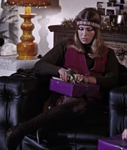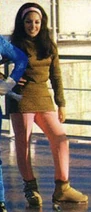 Helen (Julie Ege) is a Scandinavian patient who is overcoming an allergy to lamb. Helen has dirty blonde hair. She is wearing a typical Scandinavian garb including a green short skirt and tan boots that show off her lovely legs. She has a long sleeve beige ruffle undershirt that exposes her plunging neck line. Over the shirt is a vest like top that serves as bustier, and completes the bunad (Norwegian folk costume dress). Rosemaling embroidery patterns appear on the vest, in the form of flowers.