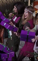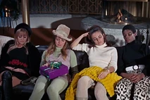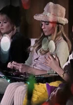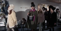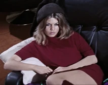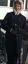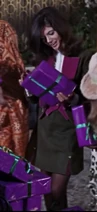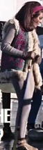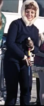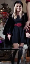 When the girls are receiving their final instructions in the Alpine Room, she is seated on the couch next to Nancy. She is wearing a black minidress with a red patterned belt. Over the top of her dress is a black fur coat and matching fur Russian hat. She has black leather thigh high boots on.