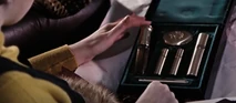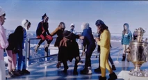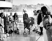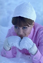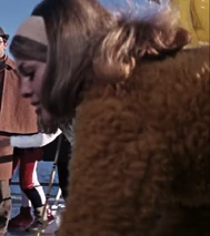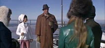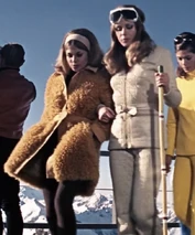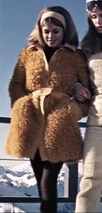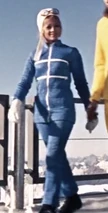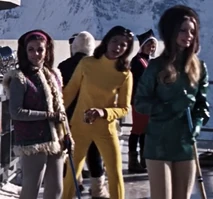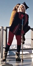 The following morning, Bond meets the girls on the observation deck where the girls are engaged in a game of curling. Ruby is dressed in a navy coat with a tan wrap-around fur hat and black gloves. Bond arranges to meet Ruby at eight o’clock. However, when 007 breaks into her room he is instead met by Bunt, whose men knock him unconscious.