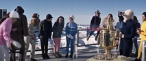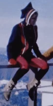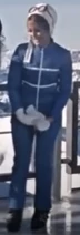 When Sir Hillary meets the girls on the observation deck for their game of curling, the Austrian Girl is dressed in a blue ski outfit with a white hat and sunglasses on the top of her head.