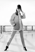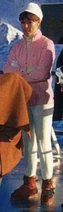 The next day, she wears tight white ski pants, with a pink coat. She has boots on, dons white gloves. Here hair is worn up and inside a white cap.