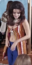 The Israeli Girl (Helena Ronee) is a patient who is overcoming an allergy to shellfish. She a brunette who is wearing blue loose fitting pants. Her top is a red and orange colored vest like brassiere that hangs down like a hippie at the bottom. It exposes a bare stomach and lovely cleavage. She has a choker style necklace that hangs down in strings. She has matching hanging beads that hang from the middle of her top over her upper stomach.