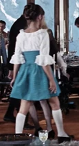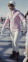 In the Alpine Room, while receiving her final instructions, the Irish Girl wears white ski pants and a light blue sweater with pink and white circles near the neckline. She is carrying a tan and white fur coat, and her hair is worn back in a ponytail.