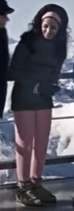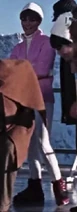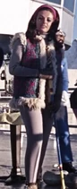 The next morning on top of the observation deck, the Indian Girl is wearing pink ski pants with an olive colored jacket. She has a matching pink head band on her head pulling her hair back.