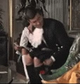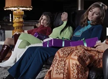 When Sir Hillary arrives, the German Girl is knitting like the rest of the girls to pass the time. She invites him to sit down, which he does next to her on the couch. The rest of the girls join in around them.