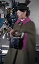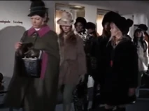 When the girls receive their final instructions in the Alpine Room, the German Girl is wearing a dark olive dress that has pink lapels. The dress is short, revealing her black stockings and gorgeous legs with pink high heels. Her dark brown hair is now worn down. When she leaves to get on the gondola, she has a matching olive coat with pink accents, and a black felt Fedora hat with feathers coming out of the top.