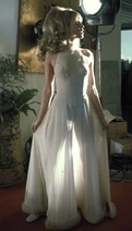 The Austrian Girl (Anouska Hempel) is a patient who is overcoming an allergy to beef. She has long blonde hair that is gathered up in a ponytail and allowed to flow down over the back half of her head. She is wearing a long beige see-through dress that gathers up high in the neck. The sleeves are exposed to show off her shoulders.