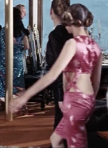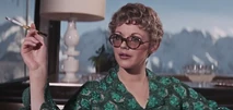 Ruby had short blonde hair that was permed. Ruby was wearing a multi green colored print silk pant suit with matching high heels. She is wearing sunglasses and is smoking a cigarette when Bond arrives at Piz Gloria.