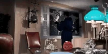 When Sir Hillary arrives at Piz Gloria, Helen is knitting on an adjoining leather chair. Bond sits nearby in the leather couch.