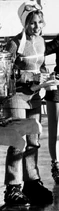 The German Girl (Ingrid Back) is a patient who is overcoming an allergy to citrus. The German girl is dressed in what is called a Dirndl, which is a Bavarian word for the dress that women wore. The dress consists of a short blue skirt that cuts off above the knees. Her lower legs are covered by thick white hosiery and she has black shoes on. She has a white blouse with ruffled sleeves that end at the elbows. Her apron is also blue, and acts as a bustier. She has jet black hair that is pulled back in a tight ponytail bun, and the excess hair is curled and weaved. She wears a metal chain around her neck and the medallion hangs down to invite onlookers to her cleavage from her plunging neckline.
