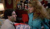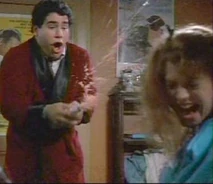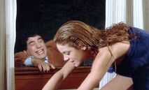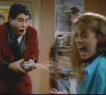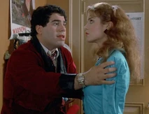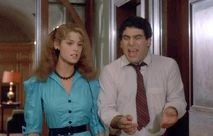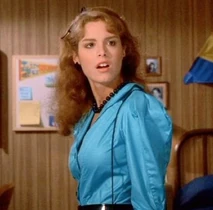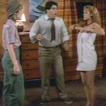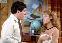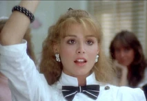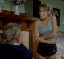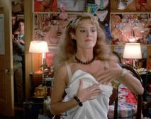 Another hilarious scene is when Jordan shows up at the men's dorm looking for Jim. Jim has runaway for the weekend with Christine for a romantic getaway. Bubba (Michael Zorek), Jim's best friend, attempts to buy some time for Jim thinking he will be returning soon. In the process of trying to keep Jordan from leaving, several other friends sneak into the room and are hiding out to get a better look at her. They have placed bets on how many body parts they will be able to catch a glimpse of. Bubba spills pink champagne all over the front of Jordan's blue jumpsuit. As a result, Bubba suggests she take off her outfit which she does. Underneath, Jordan is wearing a nude colored bra with tiger print panties. About this time, Betsy (Kathleen Wilhoite), who is Christine's best friend, and Bubba's girlfriend shows up at the dorm. She opens the door in time to watch Jordan coming out of the bathroom with only a towel covering her bra and panties. Betsy is irate, and when she finds out that Jordan is there to see Jim, she spills the beans about Jim being off with Christine for the weekend. Jordan is now infuriated with Bubba for wasting his time, and uses some boxing gloves to begin pounding the defenseless boy. As she hits away, one of the boys hiding under the bed uses this opportunity to pull her towel off, exposing her in her underwear again. Slowly, each of the other guys in the room expose their hiding spots to her and Jordan erupts revenge on them. Betsy and Jordan team up to knock Bubba out of the two story window.