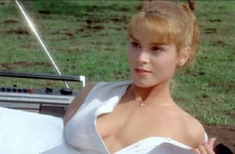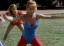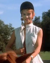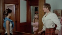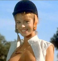 Jordan's first "exposure" is where she is dressed in her riding gear on top of her horse, during a dressage class the girls have with the boys. She says some catty stuff to Christine and Betsy while opening her shirt and exposing her bare breasts to Jim. As she rides away from them, Betsy reaches the boiling point. She rides after Jordan, and rips the rest of her blouse off. Jordan doesn't seem to mind a bit and continues to ride bare breasted around the field for all to see.
