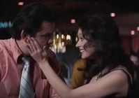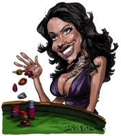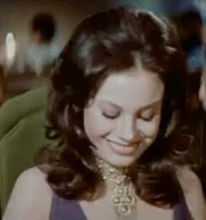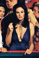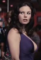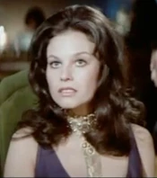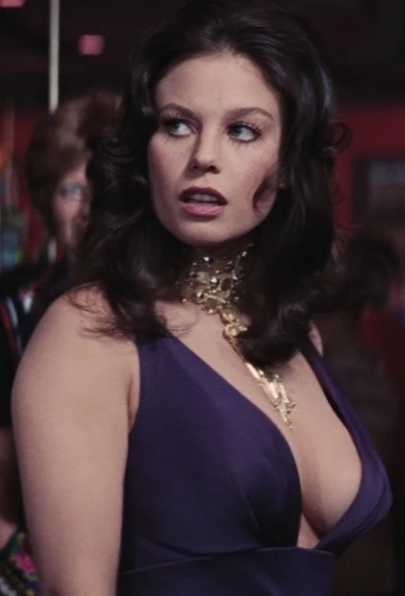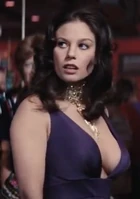 Plenty when first seen in the film is working the casino floor at the Whyte House Hotel. She is wearing a purple silk-jersey evening gown that plunges in the front, revealing her enormous talents. She has long black hair that is curled on the sides. She is wearing an elaborate gold choker necklace with a perfectly placed pendant that hangs down a good four inches, drawing the attention of those voluptuous charms. Her outfit and talents are the perfect scene-stealer for her small screen time, that outshone even that of the films Bond girl (Tiffany Case).