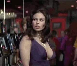 We next see her leaning over the table as Bond grabs the dice. Her opening line is “Hi, I’m Plenty”. Bond takes a look at her ample cleavage hanging out of her dress, and responds, “But of course you are”. Plenty quickly adds, “Plenty O’Toole”. Bond then says, “Named after your father perhaps?”.