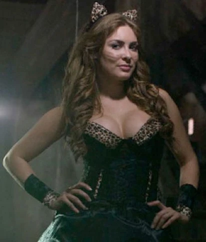 We first see Suzanne, as she arrives at the home of her friend Maddie (Monica Keena). At the home is Suzanne’s additional friend Lily (Diora Baird), who happens to be wearing a similar sexy kitty outfit as Suzanne. Because of the similarity, Suzanne is upset with Lily for not coordinating with her about their outfits. Suzanne’s outfit includes a black leather corset and short black miniskirt. The corset reveals Suzanne’s leopard print bra. Her miniskirt flares outward and has leopard print fur at the ends. She has black high heels, fishnet stockings. In addition, she has kitty ears on, drawn on whiskers, a tail and opera gloves.
