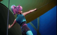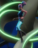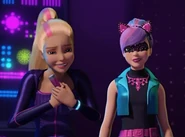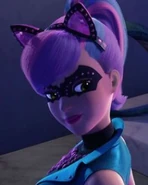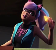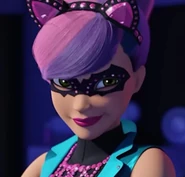 What she didn't know was Dunbar's plan to use the EMP weapon to freeze all active global technologies and destroy the I3 server. To her surprise, Dunbar suggests that the other half of the plan completion should finalize it all. After answering his question about whose side to choose, to which she chose herself, evaded some "wicked robots" and left. She later joined Barbie's side and aided the team to ward off Dunbar and save the technologies from harm. When normal, she has blonde hair and wears a teal leotard. Patricia has green cat-like eyes and violet-colored hair with pink stripes as the Cat Burglar, and she wears a jeweled bat-shaped black mask as well as jewelled cat-ears and an elaborate pink jewelled necklace when she is stealing gems. Her thieving costume also consist of high black laced boots over turquoise tights, a short black dress with a pink belt and a sleeveless short turquoise vest the exact same color of her tights that she wears over her dress.