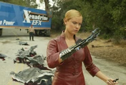 When she arrives at Katherine Brewsters vet clinic she coincidentally finds a blood sample of John Connor, who is supposed to become the main leader of the resistance, and makes him her primary target. The T-X interrogates Katherine about John, but another Terminator (the T-800), send by the resistance, interveines. John and Katherine drive away and the T-X chases them in a large truck, firing her plasma gun at them and also using remote controlled vehicles. The T-800 manages to interfere once again and crashes the T-X's truck.