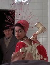 Unfortunately, Vulnavia is surprised by Trout and his assistant as she is carrying out Phibes' command to destroy his mechanical creations. As she backs away from them, she is sprayed with the acid and apparently killed [or disfigured; the off camera scream she makes is the only sound she ever makes in both this movie and the sequel].