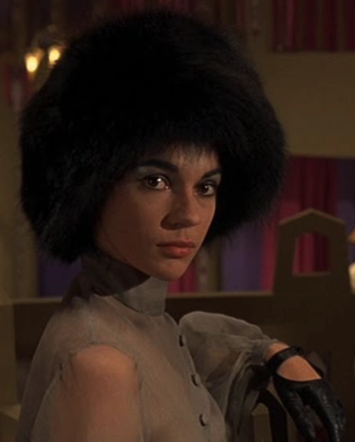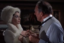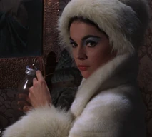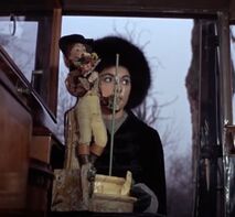 Next we see Vulnavia dressed in all black fur with a greyhound dog on a leash, pretending to be a damsel in distress with car trouble. When Dr. Hedgepath (David Hutcheson) rides past her, he directs his chauffeur to stop and help the girl. Dr Phibes kills the chauffeur while Vulnavia inserts a doll into the backseat of the doctor's limo. Then they seal the doors, and Phibes hooks up a device that makes the inside of the car instantly grow frosty cold. The doctor freezes to death at a temperature of under 100 degrees below zero. Phibes celebrates back at his lair while Vulnavia sweeps up the floor and his mechanical band plays, in a 1920s club-like atmosphere.