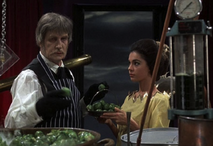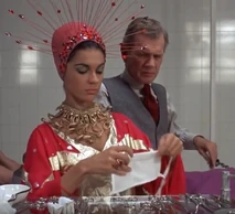 Vulnavia acts as Dr. Phibes' chauffeur as they arrive at the first doctor's home, where Dr. Dunwoody (Edward Burnham) is torn to shreds by bats that are released from a skylight. At a masquerade party, the second doctor, Dr. Hargreaves (Alex Scott), is killed when his head is crushed inside a mechanical frog's mask as it continues to tighten around his head. The third doctor, Dr. Longstreet (Terry Thomas), is setting up a film strip projector of a belly dancing girl (a sort of 1920s-esque porn) when Vulnavia enters his office. She seductively ties him to his chair and then Phibes enters. Phibes inserts an IV into his veins and drains vial after vial of his blood until he dies, while Vulnavia plays the violin.