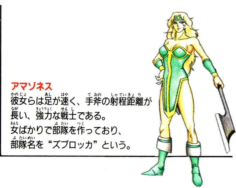 Armed with a norse battle axe, and wearing leather boots, corset and helmet of matching color, they form the cavalry unit of Death Adder's army riding various types of flightless dragon. Their appearance in game depicts them as being of medium athletic build with powerful thighs, although in some of the official box art they are illustrated as being heavily muscled amazons.
